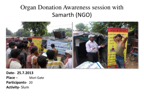 Organ Donation Awareness session with Samarth (NGO) Date- 25.7.2013 Place – Mori Gate Participants- 20 Activity- Slum