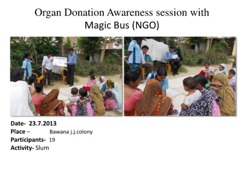 Organ Donation Awareness session with Magic Bus (NGO) Date- 23.7.2013 Place – Bawana j.j.colony Participants- 19 Activity- Slum