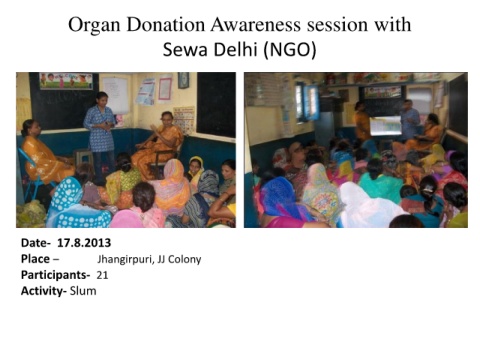 Organ Donation Awareness session with Sewa Delhi (NGO) Date- 17.8.2013 Place – Jhangirpuri, JJ Colony Participants- 21 Activity- Slum