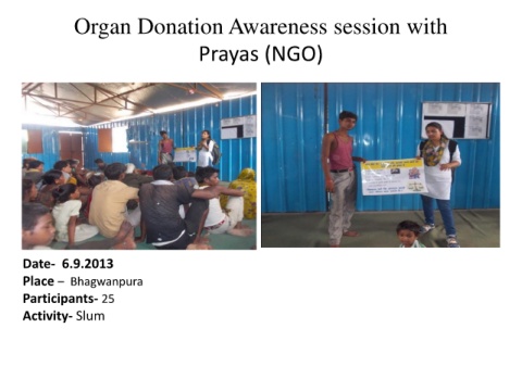 Organ Donation Awareness session with Prayas (NGO) Date- 6.9.2013 Place – Bhagwanpura Participants- 25 Activity- Slum