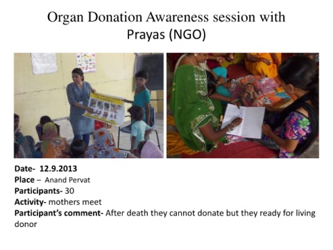 Organ Donation Awareness session with Prayas (NGO) Date- 12.9.2013 Place – Anand Pervat Participants- 30 Activity- mothers meet Participant’s comment- After death they cannot donate but they ready for living donor