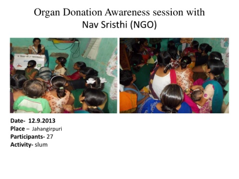 Organ Donation Awareness session with Nav Sristhi (NGO) Date- 12.9.2013 Place – Jahangirpuri Participants- 27 Activity- slum