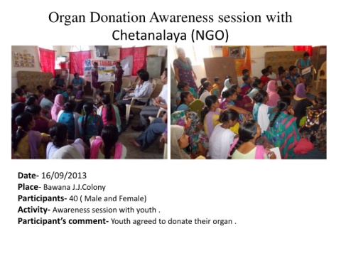 Organ Donation Awareness session with Chetanalaya (NGO) Date- 16/09/2013 Place- Bawana J.J.Colony Participants- 40 ( Male and Female) Activity- Awareness session with youth . Participant’s comment- Youth agreed to donate their organ .