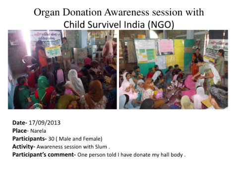 Organ Donation Awareness session with Child Survivel India (NGO) Date- 17/09/2013 Place- Narela Participants- 30 ( Male and Female) Activity- Awareness session with Slum . Participant’s comment- One person told I have donate my hall body .