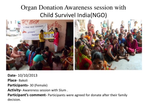 Organ Donation Awareness session with Child Survivel India(NGO) Date- 10/10/2013 Place- Bakoli Participants- 30 (Female) Activity- Awareness session with Slum . Participant’s comment- Participants were agreed for donate after their family decision.