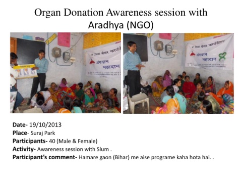 Organ Donation Awareness session with Aradhya (NGO) Date- 19/10/2013 Place- Suraj Park Participants- 40 (Male & Female) Activity- Awareness session with Slum . Participant’s comment- Hamare gaon (Bihar) me aise programe kaha hota hai. .