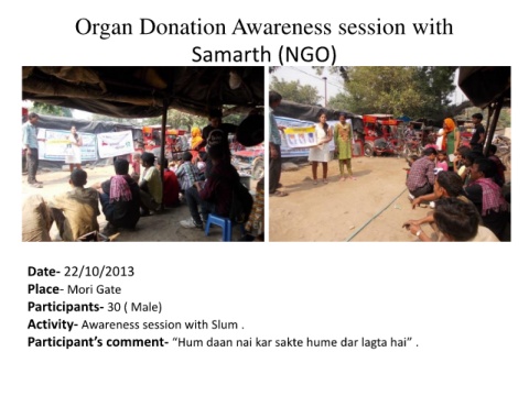 Organ Donation Awareness session with Samarth (NGO) Date- 22/10/2013 Place- Mori Gate Participants- 30 ( Male) Activity- Awareness session with Slum . Participant’s comment- “Hum daan nai kar sakte hume dar lagta hai” .