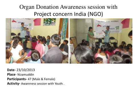 Organ Donation Awareness session with Project concern India (NGO) Date- 23/10/2013 Place- Nizamuddin Participants- 47 (Male & Female) Activity- Awareness session with Youth .