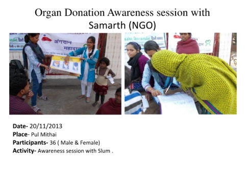 Organ Donation Awareness session with Samarth (NGO) Date- 20/11/2013 Place- Pul Mithai Participants- 36 ( Male & Female) Activity- Awareness session with Slum .