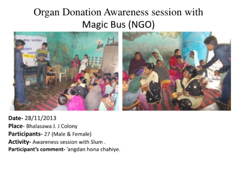 Organ Donation Awareness session with Magic Bus (NGO) Date- 28/11/2013 Place- Bhalasawa J. J Colony Participants- 27 (Male & Female) Activity- Awareness session with Slum . Participant’s comment- ’angdan hona chahiye.
