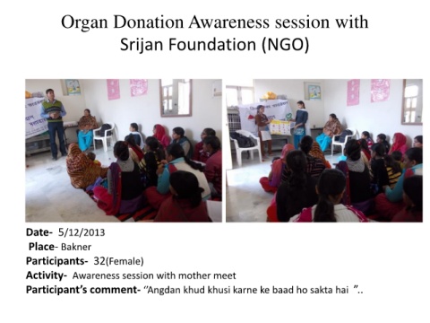 Organ Donation Awareness session with Srijan Foundation (NGO) Date- 5/12/2013 Place- Bakner Participants- 32(Female) Activity- Awareness session with mother meet Participant’s comment- ‘’Angdan khud khusi karne ke baad ho sakta hai ”..