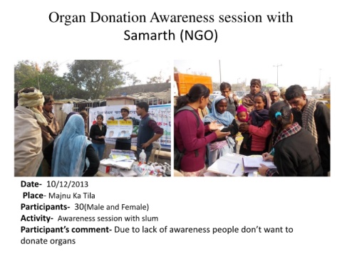 Organ Donation Awareness session with Samarth (NGO) Date- 10/12/2013 Place- Majnu Ka Tila Participants- 30(Male and Female) Activity- Awareness session with slum Participant’s comment- Due to lack of awareness people don’t want to donate organs