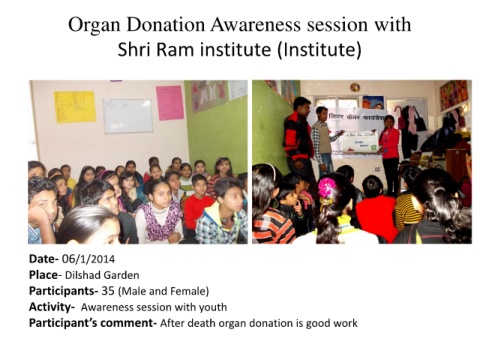 Organ Donation Awareness session with Shri Ram institute (Institute) Date- 06/1/2014 Place- Dilshad Garden Participants- 35 (Male and Female) Activity- Awareness session with youth Participant’s comment- After death organ donation is good work