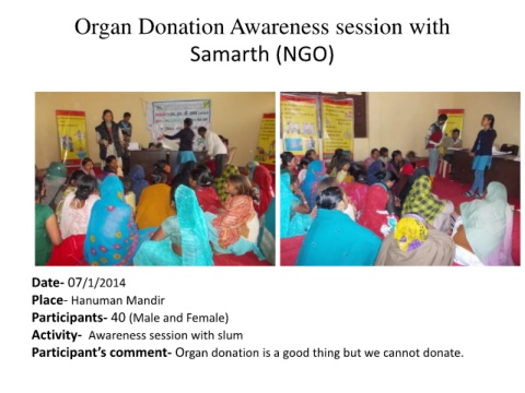 Organ Donation Awareness session with Samarth (NGO) Date- 07/1/2014 Place- Hanuman Mandir Participants- 40 (Male and Female) Activity- Awareness session with slum Participant’s comment- Organ donation is a good thing but we cannot donate.