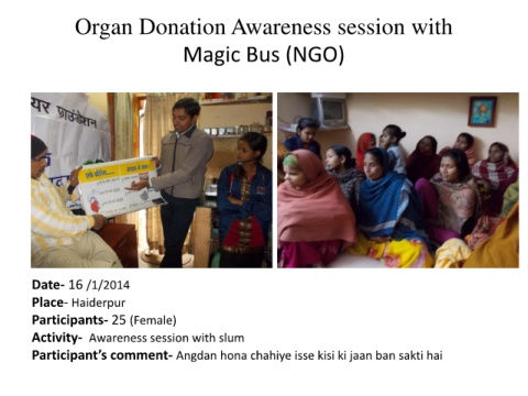 Organ Donation Awareness session with Magic Bus (NGO) Date- 16 /1/2014 Place- Haiderpur Participants- 25 (Female) Activity- Awareness session with slum Participant’s comment- Angdan hona chahiye isse kisi ki jaan ban sakti hai