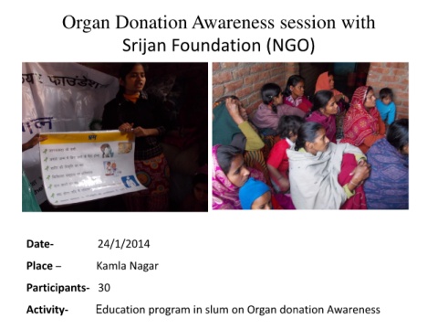 Organ Donation Awareness session with Srijan Foundation (NGO) Date- 24/1/2014 Place – Kamla Nagar Participants- 30 Activity- Education program in slum on Organ donation Awareness