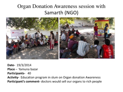 Organ Donation Awareness session with Samarth (NGO) Date- 19/3/2014 Place – Yamuna bazar Participants- 40 Activity- Education program in slum on Organ donation Awareness Participant’s comment- doctors would sell our organs to rich people